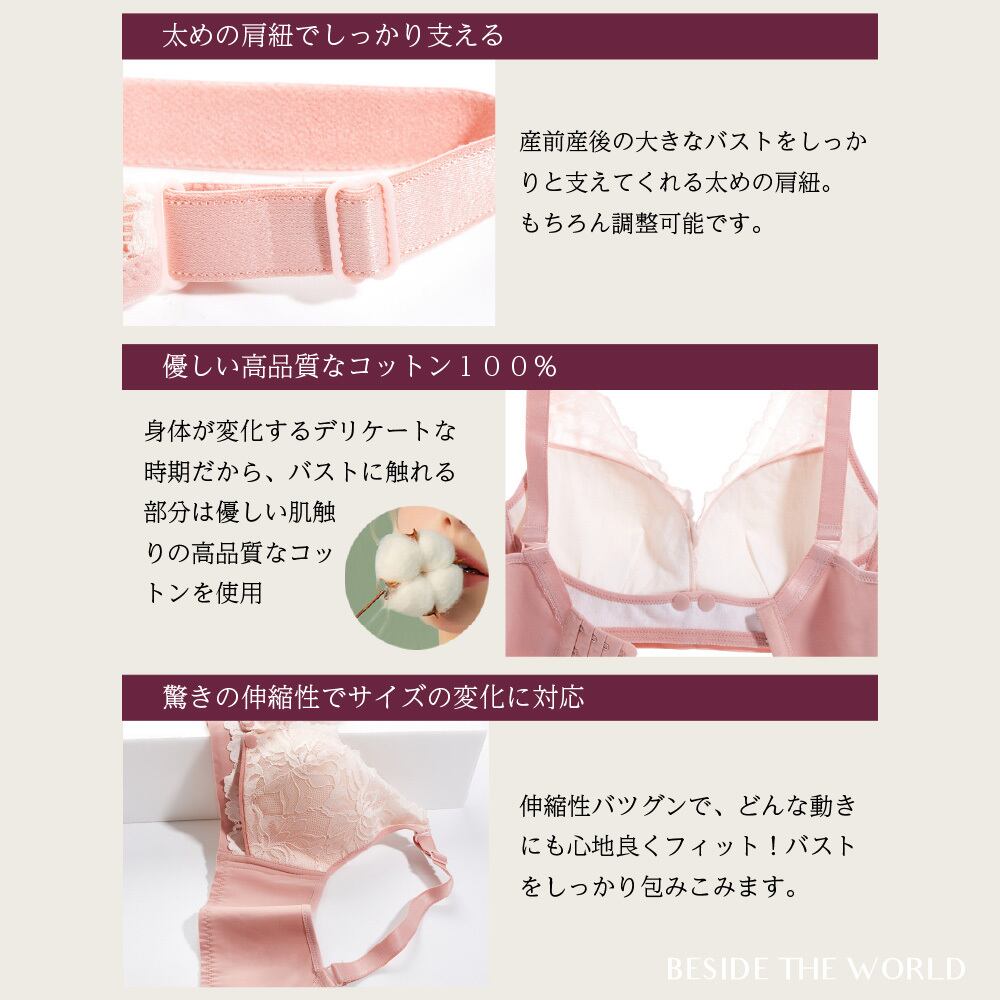 ③カップ内側は コットン100%  デリケートな身体を優しくサポート ④4段階ホックに3段階の 延長ホック 付 ⑤オシャレな巾着付き